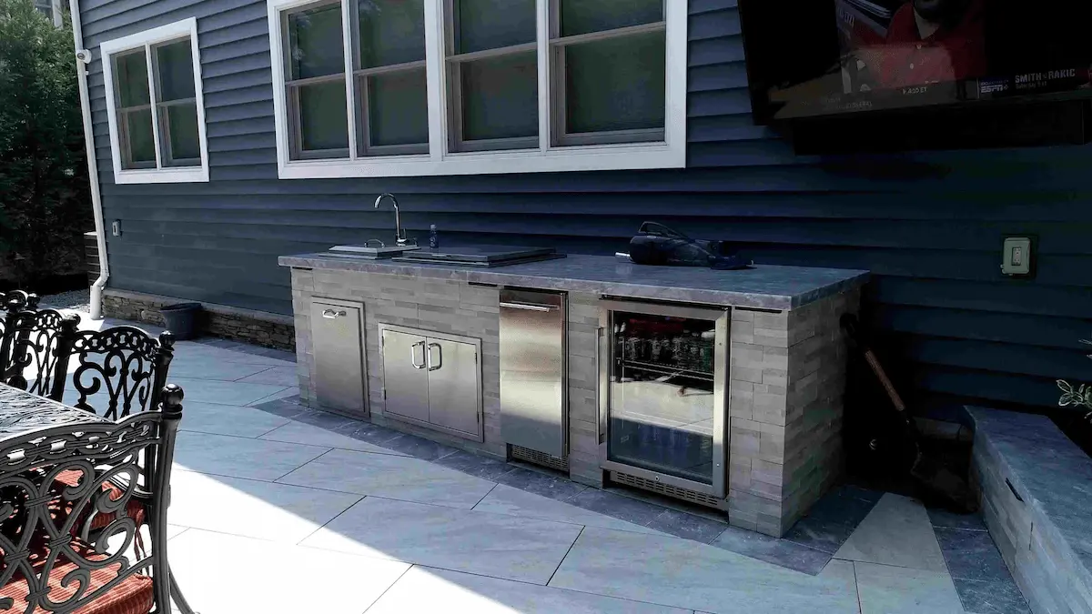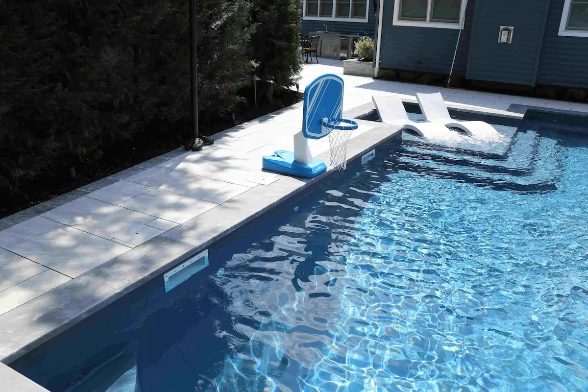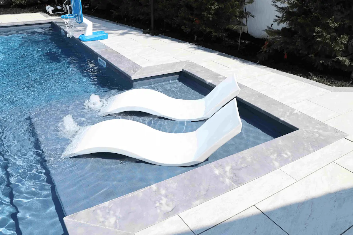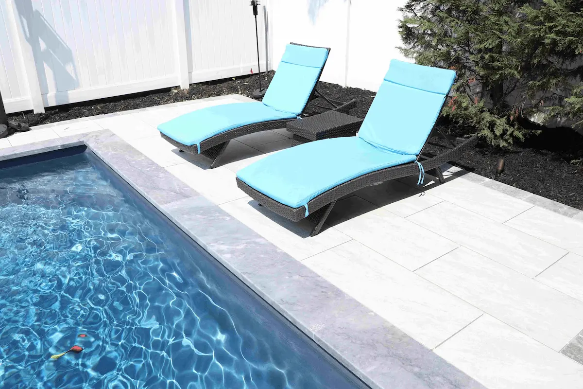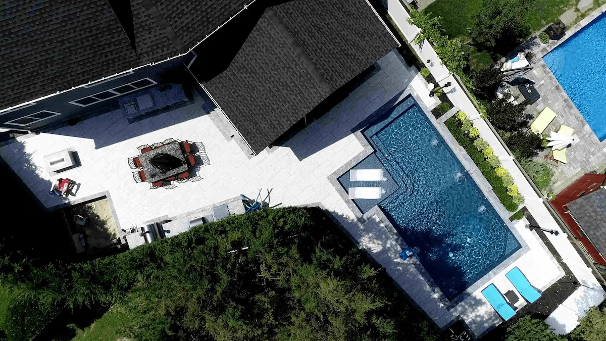 Lay porcelain pavers out to make the pool and patio flooring. Then, play around with different colored and textured pavers to create coordinating borders and wall tiles. You can even use it for a fire pit and fountain, whether you’re laying a floor around the structures or want to line the structures themselves. It will certainly elevate the look of them either way. One of the best things about porcelain pavers is how they can be made to look like anything, so you can use them to make just about any design idea come to life.